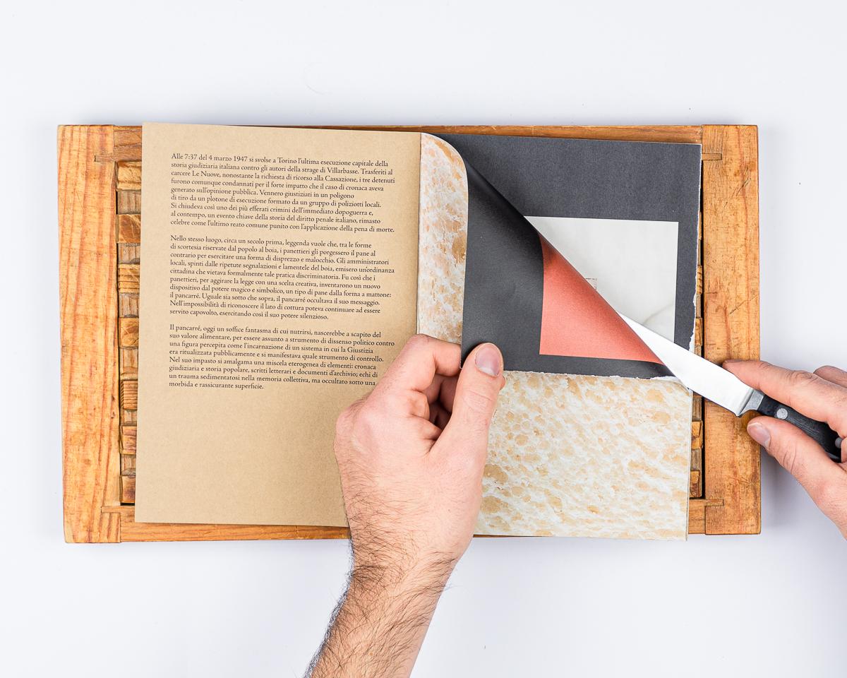 “Il progetto editoriale di Alessandro Truffa, rende l’imprecazione piemontese che anima la sua tesi di diploma all’ISIA di Urbino, pubblicata con il sostegno di Corraini Edizioni, un’arguta riflessione sul potere degli spazi di contaminazione della fotografia, lavorando su quello silenzioso del pane. Spezzato, letteralmente e graficamente, come invito provocatorio a leggerne il messaggio occulto. Non solo nella leggendaria Torino di metà Ottocento, dove il divieto di porgere ‘al contrario’ il pane al Boia, come forma sprezzante di malocchio, viene aggirato dai fornai sfornando Pancarrè (nato a Torino come “pane del boia”). La doppia superficie soffice, di un mattoncino rassicurante di dissenso politico, rivolto all’incarnazione di uno strumento di controllo rituale della Giustizia. Una superficie fragrante di dissenso, scelta dal fotografo per toccare analoghi strumenti di controllo contemporanei, occultando gli echi di un trauma sedimentato nella memoria collettiva, tra scritti letterari e documenti d’archivio, in equilibrio tra cronaca giudiziaria e storia popolare. Il falso continua a dire tanta verità. Dal felice incontro con una casa editrice che mette al centro la relazione con l’artista e il piacere della sperimentazione nasce un libro che diventa inevitabilmente progetto artistico”