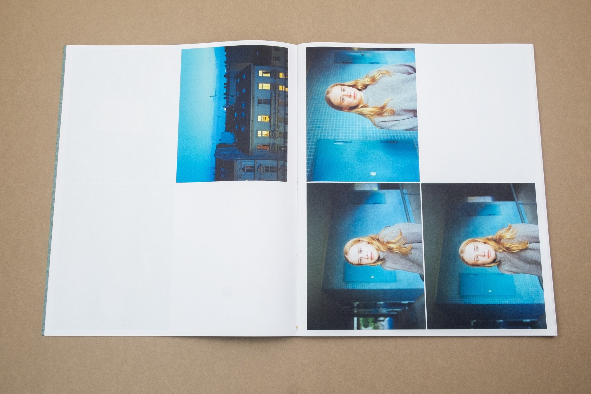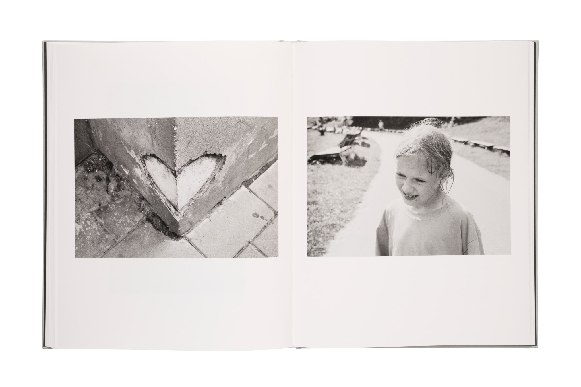 I due quartini, posti rispettivamente all’inizio e alla fine del volume, contengono immagini a colori che si pongono in netta antitesi con la sequenza fotografica interna in bianco e nero. Le immagini sono impaginate con un margine teso ma ben bilanciato sui quattro lati, contribuendo a una narrazione lineare composta da una fotografia essenziale, ma con una forte carica di ricerca e coinvolgimento emotivo.