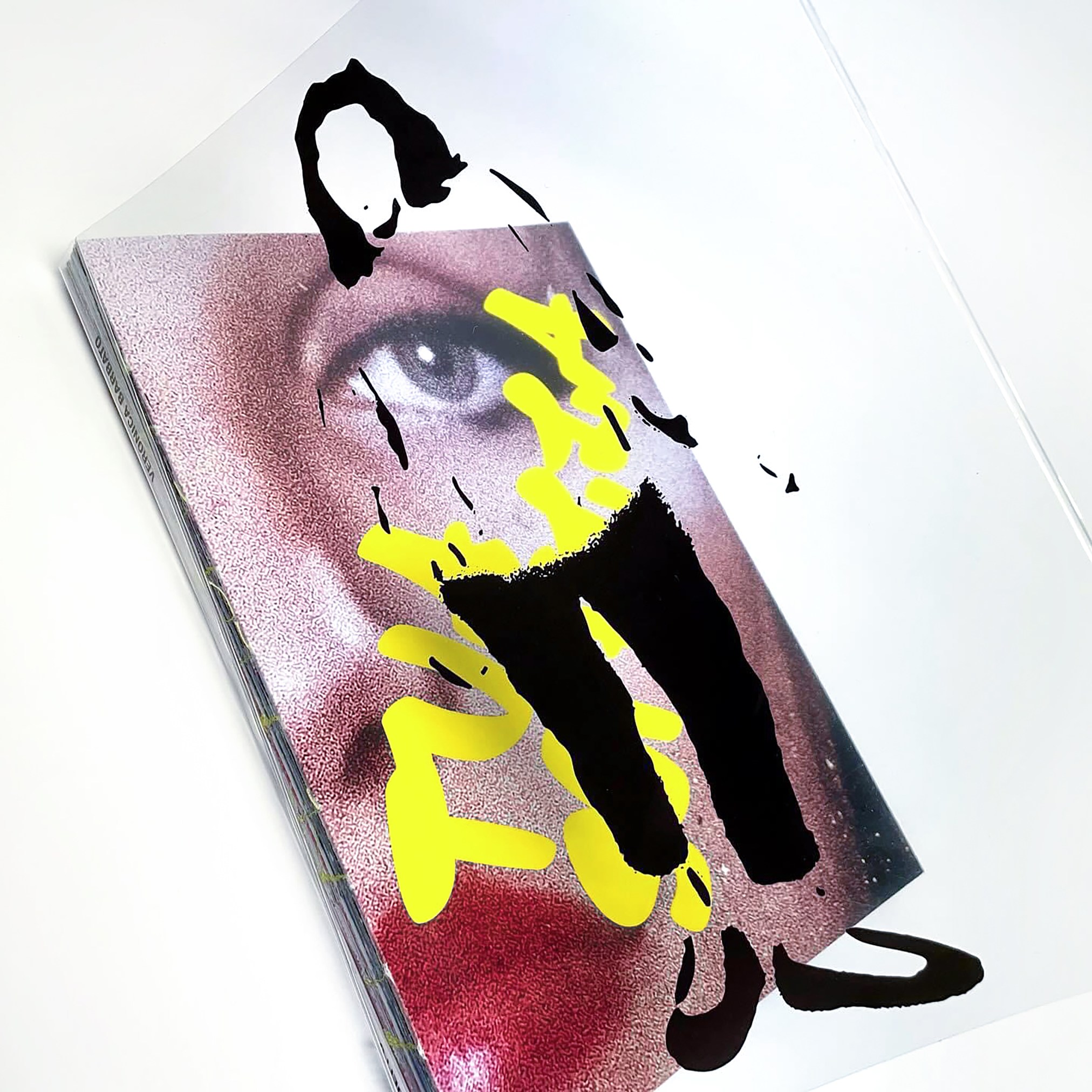 Il volume si presenta con un formato intimo e morbido. L’uso di immagini full bleed rende la narrazione immersiva e dona una cadenza ritmica all’intero impianto visivo. Alcune pagine in verde fluo ospitano testi brevi, composti con un carattere monospaziato che richiama l’estetica di una macchina da scrivere. La sovraccoperta in PVC trasparente diventa un palcoscenico semantico: unisce l’immagine di un occhio, la silhouette di una figura femminile dai tratti cancellati, e un apparato testuale e gestuale che, in giallo, definisce il titolo dell’opera.